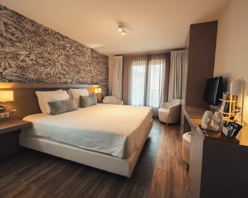 Chambre Luxe Supérieure de 25m² avec balcon au rez-de-chaussée, vue sur le jardin. Salle de bain avec douche à l’italienne, coin salon, TV, coffre-fort, minibar, plateau café/thé. Climatisée, non-fumeur, animaux non admis.